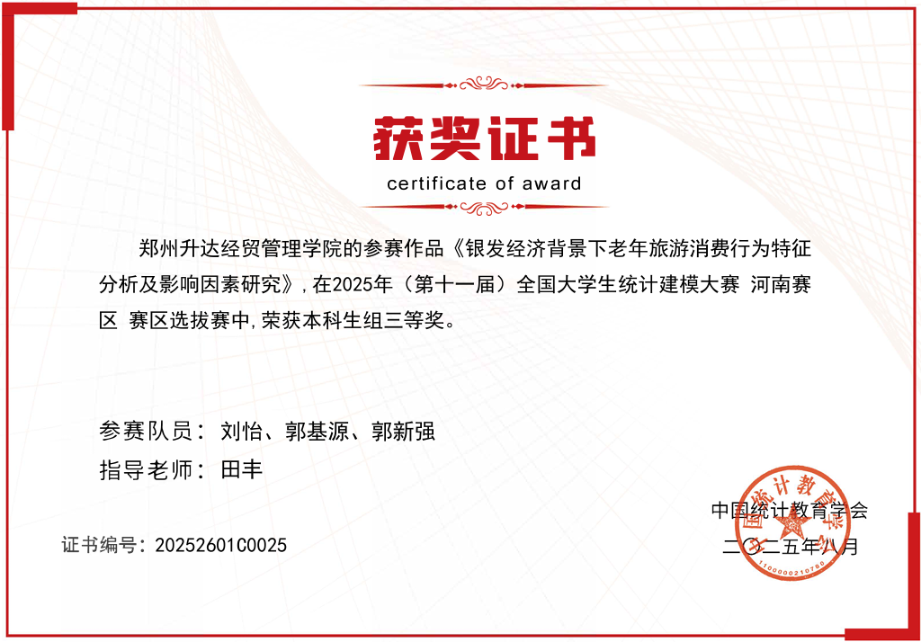 近日,2025年第十一届全国大学生统计建模大赛(以下简称“大赛”)发布获奖结果,通过激烈角逐,我院大数据管理与应用专业学子喜获佳绩,荣获河南省本科组三等奖2项,实现在此项赛事零的突破。