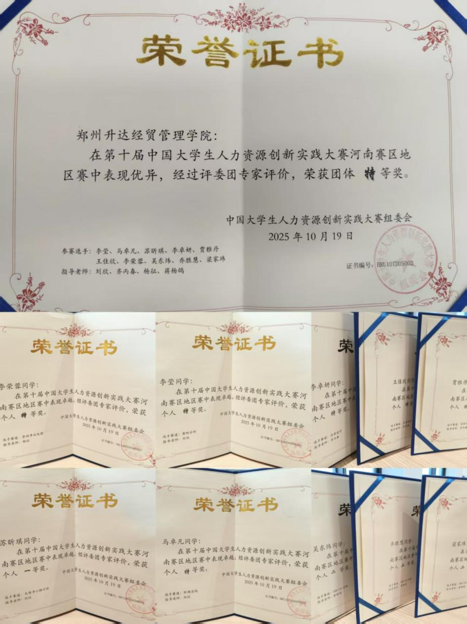 2025年10月18日至10月19日,第十届中国大学生人力资源创新实践大赛河南地区赛在河南科技学院成功举办,来自近20所高校的数百名选手展开同台竞技。必赢626net入口刘欣、齐丙春、蒋杨鸽、杨征四位老师指导的10名学子代表我校参加了地区赛,经过为期两天的激烈角逐,我校学子以河南省第一名的佳绩荣获团体特等奖,顺利进入全国总决赛。其中,劳动争议处理、实务设计、职场实战、案例分析赛道获特等奖,无领导小组讨论赛道获一等奖,HR+AI实操赛道获二等奖。