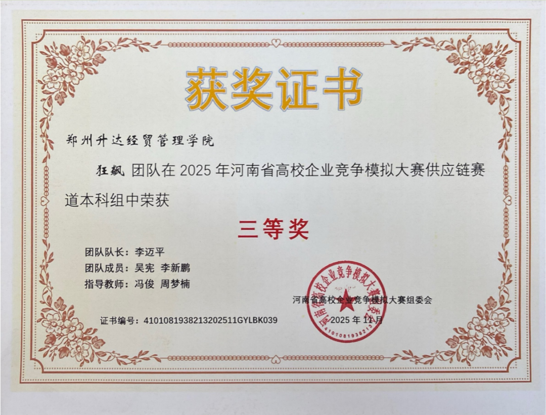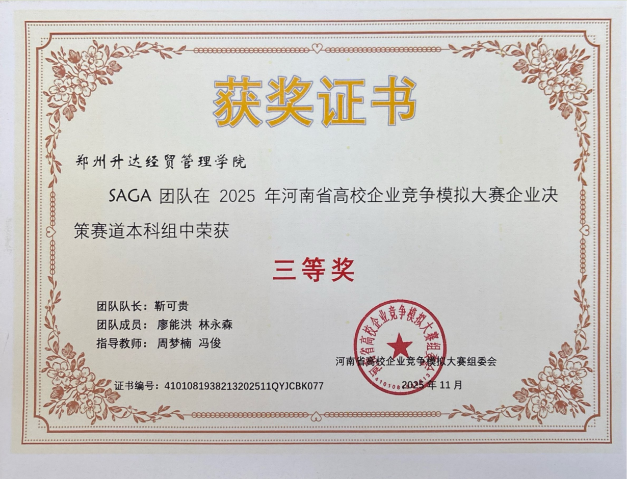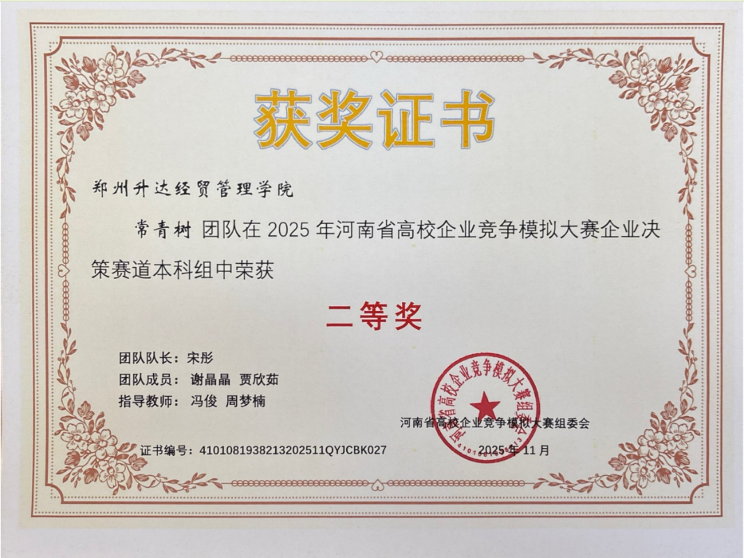 2025年11月30日,2025年河南省高校企业竞争模拟大赛决赛在郑州工商学院圆满落幕。我校必赢626net入口冯俊老师、周梦楠老师指导的3支队伍历经初赛、复赛的层层选拔,成功跻身决赛舞台,与来自全省34所院校的171支精英队伍同台竞技,经过两天的激烈角逐,3支队伍分别荣获全省总决赛团体二等奖和三等奖。
