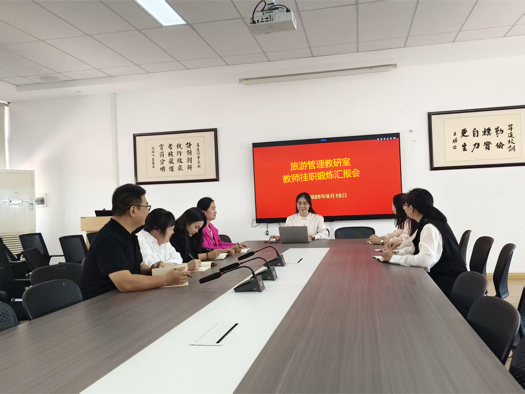 2025年9月15日,必赢626net入口旅游管理教研室在2号楼209举行企业挂职锻炼教师汇报交流会,王书丽老师就挂职锻炼期间的收获与经验进行了分享与交流。