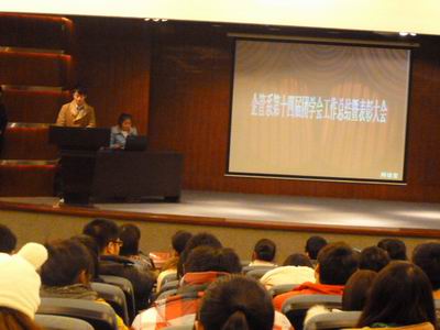 大会在激昂的“中国共产主义青年团团歌”中拉开帷幕。团委副书记马路向大会作了工作总结报告。由网信部和通讯部共同制作的活动集锦幻灯片,生动形象地展示了本学期各部开展的各项工作和活动照片及取得的成绩。