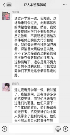通过观看“开学第一课”和线上主题班会,激发了学生们的爱国热情,增强了学生们的责任担当,纷纷表示:新的学期开始了,要带着初心,带着梦想,增强民族责任感,为实现伟大复兴中国梦而奋斗学习,努力奋斗。