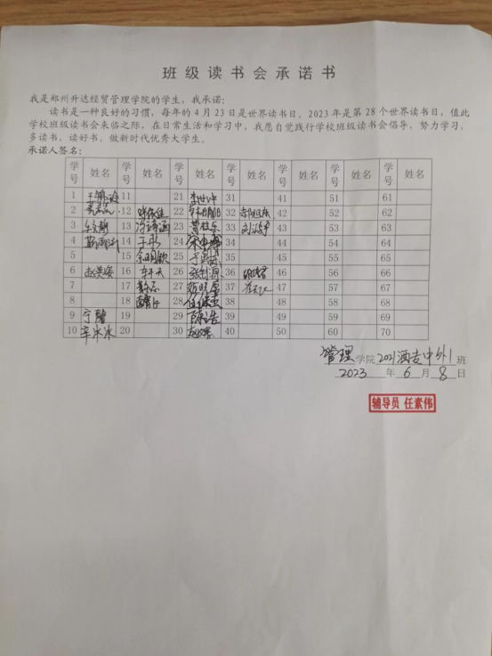 会后,所有学生在《班级读书会承诺书》上签字承诺,自觉在以后的生活中多读书,读好书。为实现个人梦想和国家梦想付出自己应有的努力,争做新时代优秀大学生。
