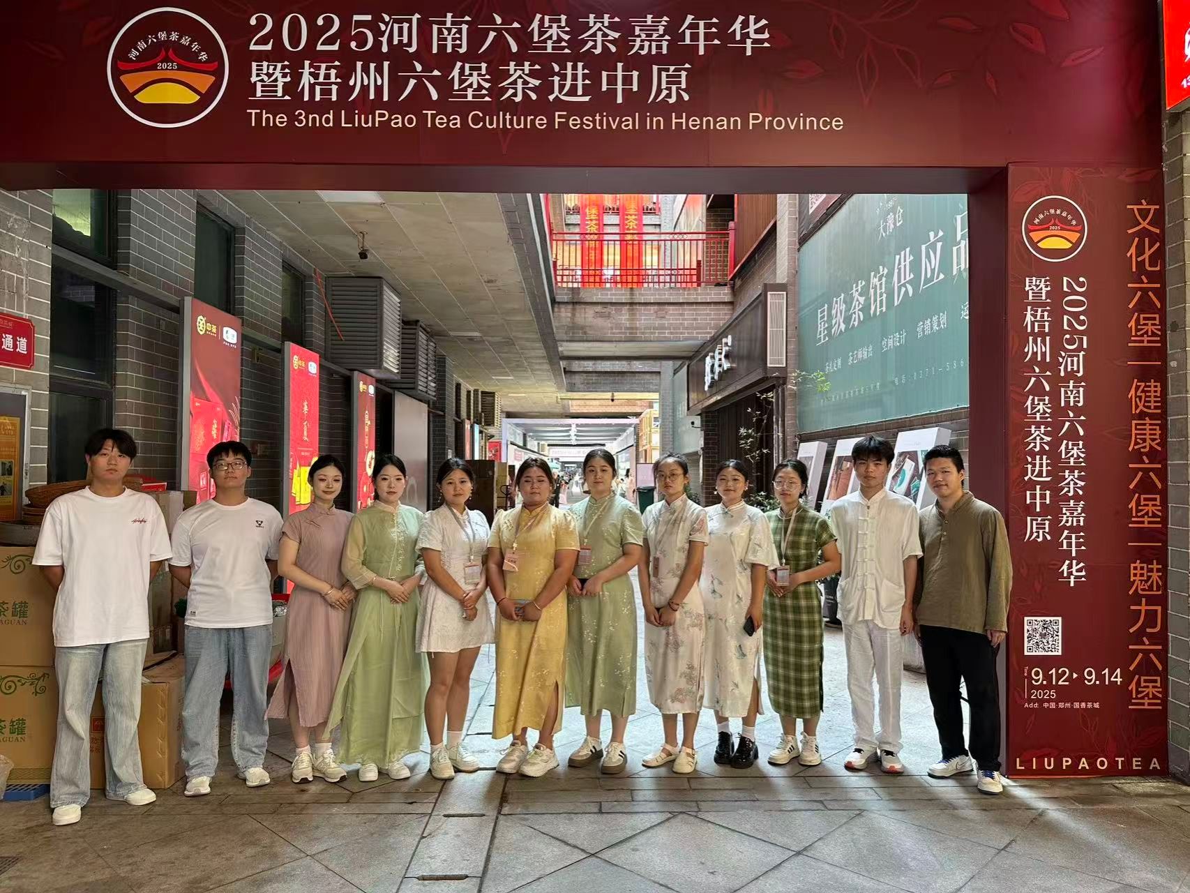 9月12日至14日,“2025河南六堡茶文化节暨梧州六堡茶进中原”活动在河南国香茶城盛大举行。旅游管理专业教师马逸为、李梦茹带队,樊鹏博等13名学生参加此次活动志愿者,引起良好社会反响,受到活动主承办单位的一致好评。