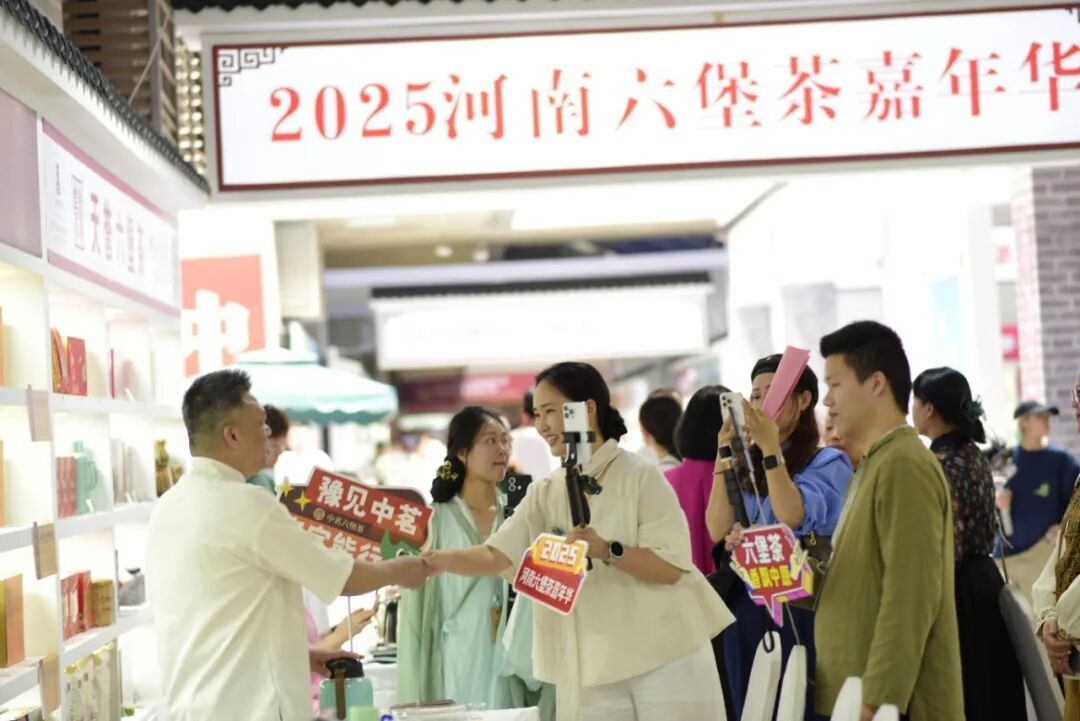六堡茶好物推荐直播间,两名志愿者化身“推荐官”,手持直播设备与茶城主播一起走遍各大茶商展位,通过网络直播宣传、线上互动,让对六堡茶感兴趣的广大网友云逛展,加大了六堡茶热度,让更多人了解六堡茶。