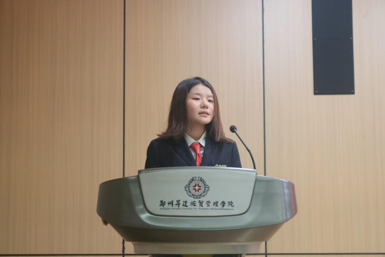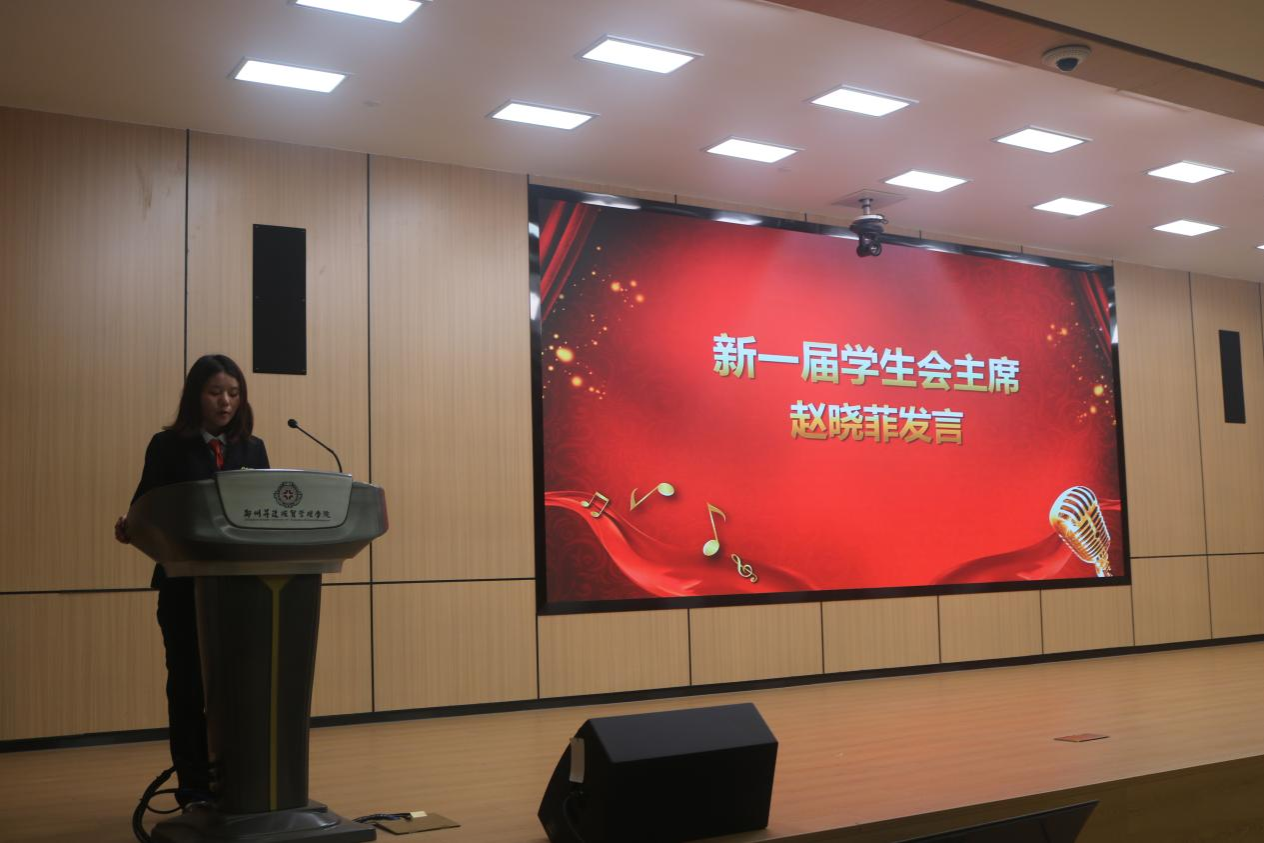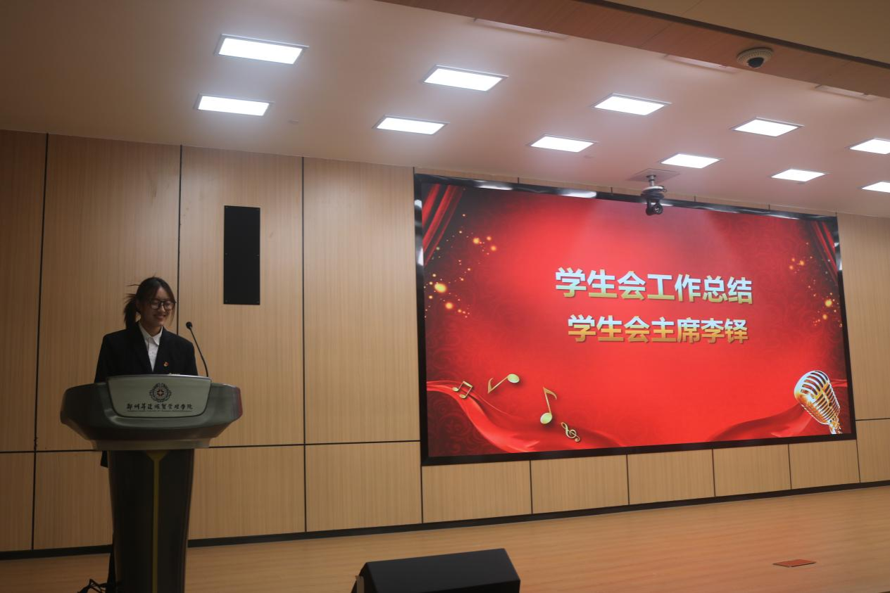 新一届学生会主席赵晓菲学姐进行发言。她向所有支持与信任团学会的老师、同学表达感谢,分享自己在团学工作中的成长与收获,并指明未来将从四个方面进行工作:强化思想引领,筑牢信念根基;服务同学成长,搭建多元平台;完善内部建设,提升工作效能;传承优良传统,勇于开拓创新;更展望未来的发展蓝图,呼吁全体成员以奋斗精神为指引,在攻坚克难中续写团学工作的精彩篇章。
