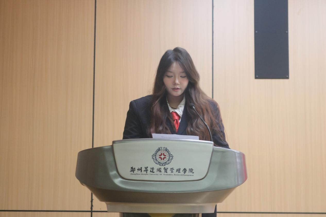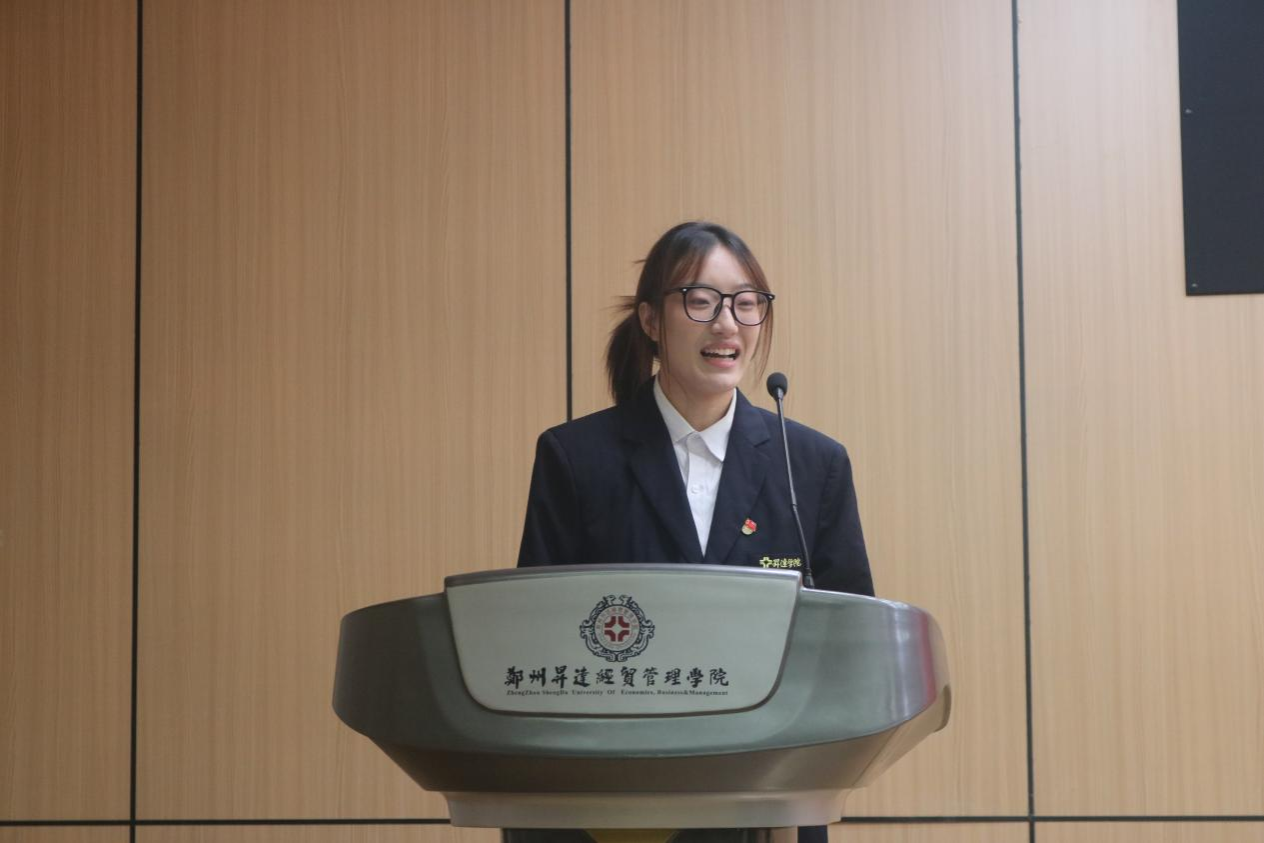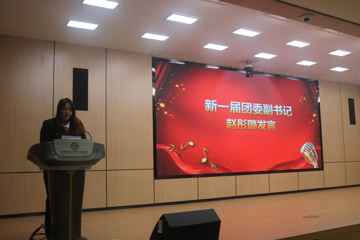 新一届团委副书记赵彤璐学姐上台发言。回首过往的两年经历,她表示:回顾在团学组织的成长历程,每一步都充满收获。她表示我们的核心始终是是“服务同学,凝聚青年”,也让我们明白我们仍然有优化的空间。我们也要始终记得我们是“同学的组织”,应该铭记为大家服务是我们不变的初心。希望新的一届团队能以“认真”与“真诚”继续前行,让我们更好的开展团学工作,将团学工作做的更加的精彩。