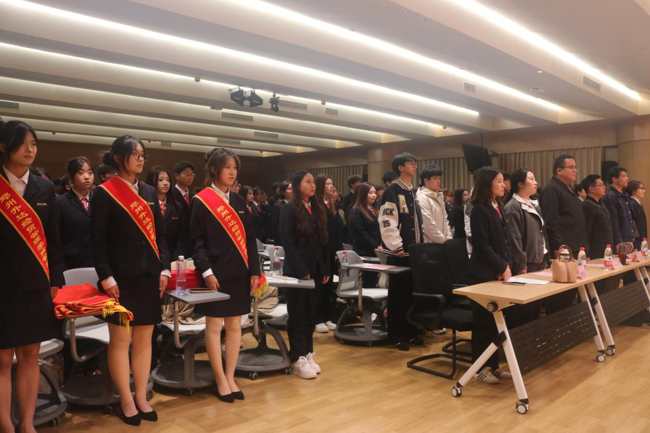 大会伊始,全体成员起立,齐唱《中国共青团团歌》。激昂的旋律在会场回荡,拉开大会的序幕。随后,现场播放第27届团学会活动集锦的视频,一幕幕精彩画面闪过,既有成员们为活动奔波的忙碌身影,也有活动成功举办时的欢声笑语,这些影像既是27届团学会成员的青春纪念册,也让第28届新成员对团学工作的温度与价值有更直观的感知,更凝聚起团队协作的信念。