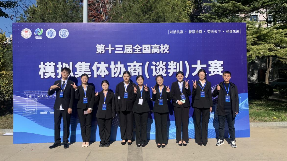 第十三届全国高校模拟集体协商(谈判)大赛于2025年11月1日至2日在北京物资学院举办。大赛由中国人力资源开发研究会劳动关系分会主办,北京物资学院商学院承办。我校必赢626net入口人力资源管理专业选派资方、劳方两支代表队,共8名学生,由王军旗老师带队参赛。