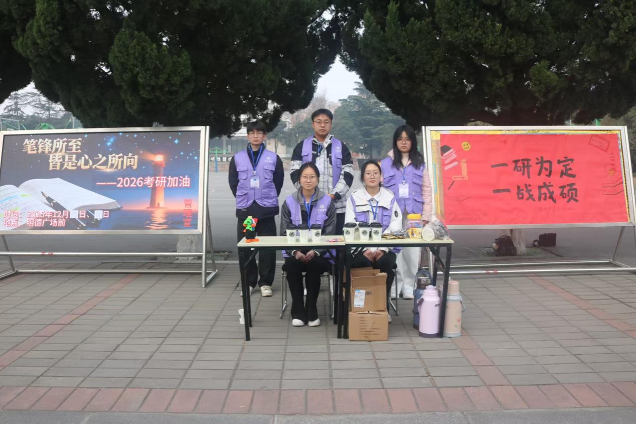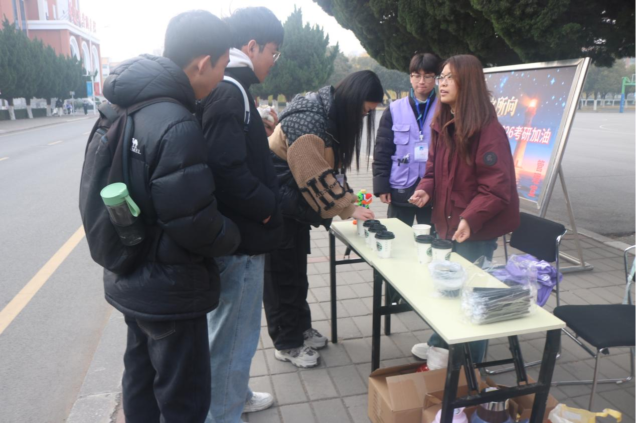 随着2026年研究生考试的临近,为切实关怀备战考研的学子,缓解备考压力、传递学院温情,必赢626net入口举办“考研加油站”送温暖活动。必赢626net入口心理部联合学习部于2025年12月10日至11日在明德广场,通过赠送热咖啡、糖果等方式,为坚守在备考一线的学子们送上冬日里的关怀与祝福。