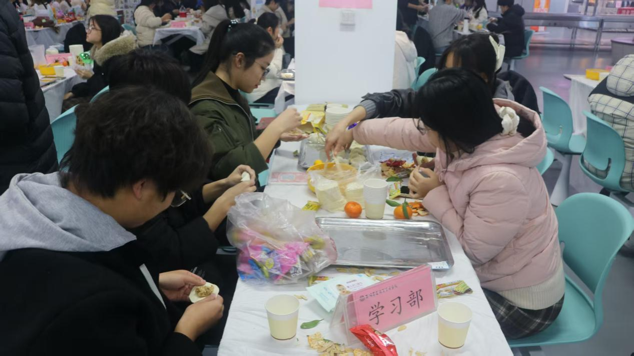 为尊重和照顾同学们的饮食习惯,心理部提前准备多样化的馅料。在等待饺子出锅的间隙,各部门围坐在一起,吃着琳琅满目的零食,观看现场组织的轻松有趣的小游戏和即兴才艺展示。同学们踊跃参与,或一展歌喉,或随乐起舞,青春的活力与热情洋溢在整个空间,进一步拉近彼此的距离。