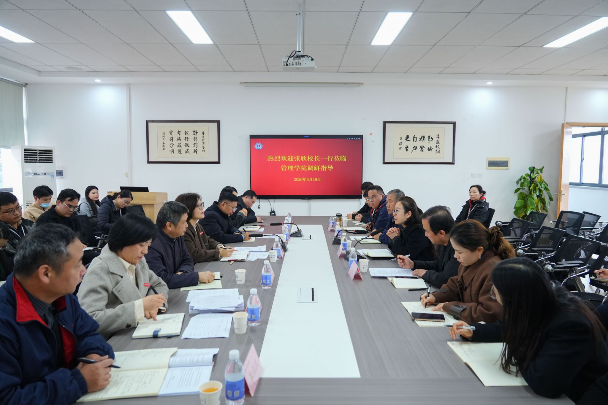 张欣指出,人才是第一资源,成果是硬核指标。要聚焦核心,全力突破师资队伍与高水平成果的瓶颈。在师资建设上,要坚持“引育并举”,既要主动出击,精准、柔性引进高层次人才和优秀博士,也要注重内部培育,依托人事处、教师发展中心、创新生态统筹中心等部门,完善教师成长支持体系,整合盘活校内现有高层次人才资源,提升全校师资整体水平。在科研创新上,要不断完善工作与激励机制,科研处、学科办、各二级学院要加强对国家级、省部级重大项目申报的辅导与组织协同;要营造浓厚的学术氛围,支持教师组建团队、聚焦前沿、潜心研究,积极申报国家级、省部级科研项目,力争在高级别项目、高水平论文、高价值智库报告、高质量成果转化上实现新突破,切实支撑申硕工作。