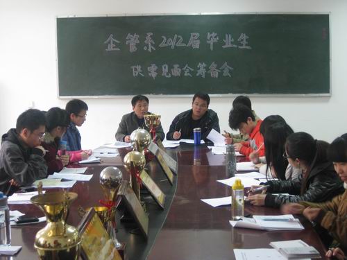 为确保企管系2012届毕业生供需见面会能够顺利进行,11月8日中午12:40,企管系在教学2号楼会议室召开供需见面会筹备会。行政秘书职正路、辅导员许广庆及团学会主要成员参加了此次会议。