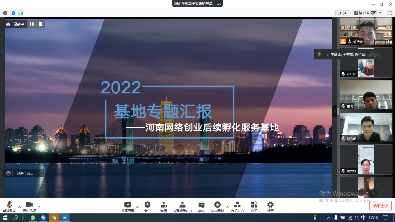 王智晓校友对母校长期以来的教育培养表示感谢,汇报了毕业后的奋斗历程和亲身感悟,并介绍了河南网创后续孵化服务基地概况。该基地分两个主体,其中苗圃区公司主体的主业是进行学员后续服务的“选”“孵”“投”,肩负着打造优良的全要素的电商创业空间和河南后续服务“样板间”的使命;加速区公司主体主业主要是为加速阶段电商企业提供综合服务,为小微电商企业提供电商项目孵化、空间入住、运营管理、运营优化等服务。